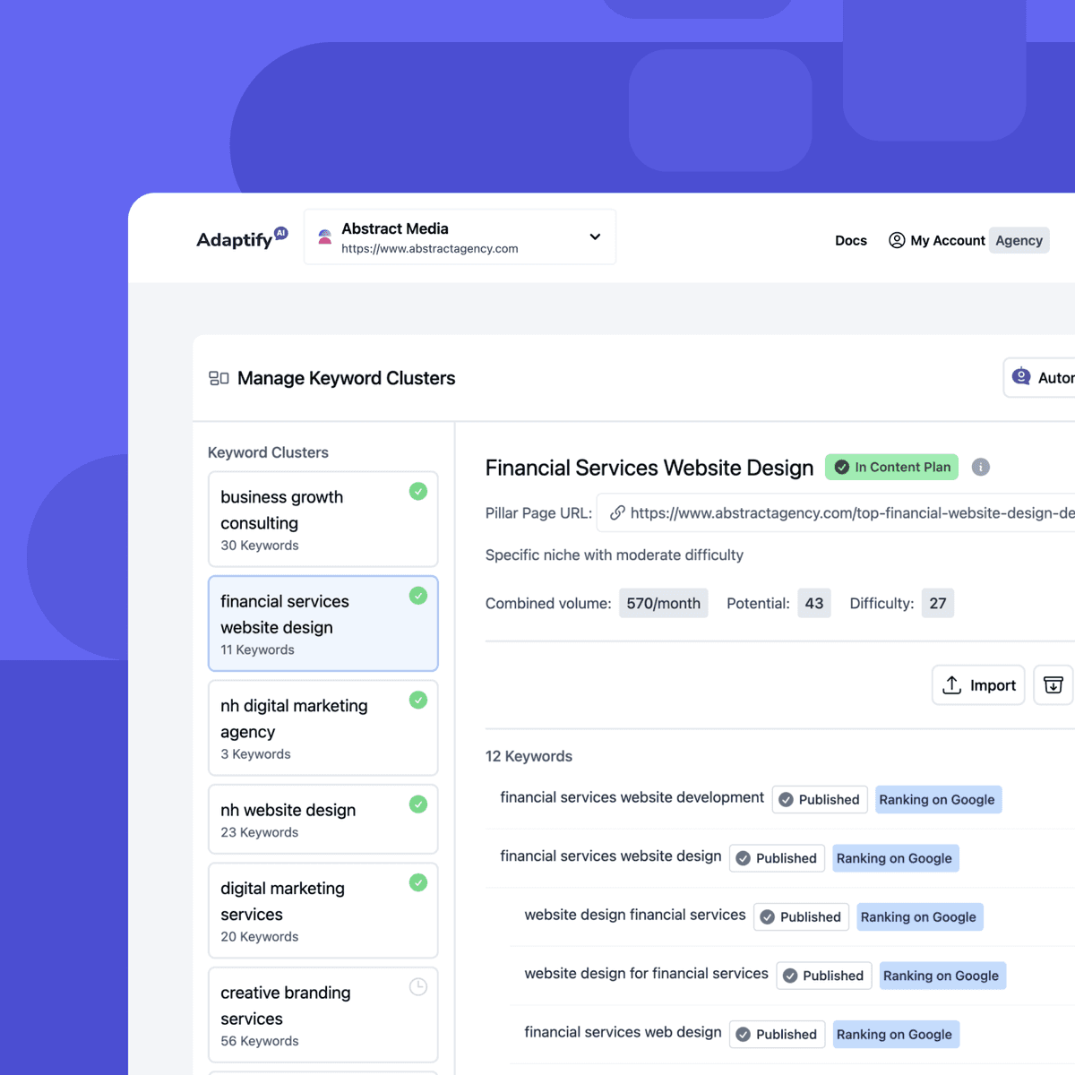 Adaptify's AI scans industry trends, competitors, and web content to suggest high-performing topics. This ensures your client's content stays aligned with their industry and performs well in search results.