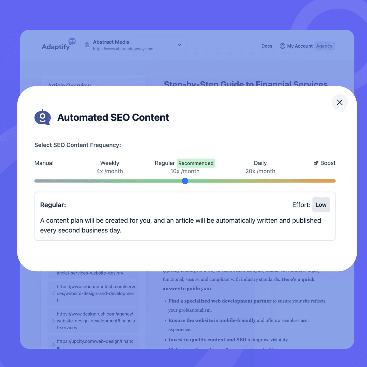After generating and optimizing content, Adaptify creates a 30-day content plan for you and automatically publishes blogs for your website. You can even customize how frequently articles are published.
