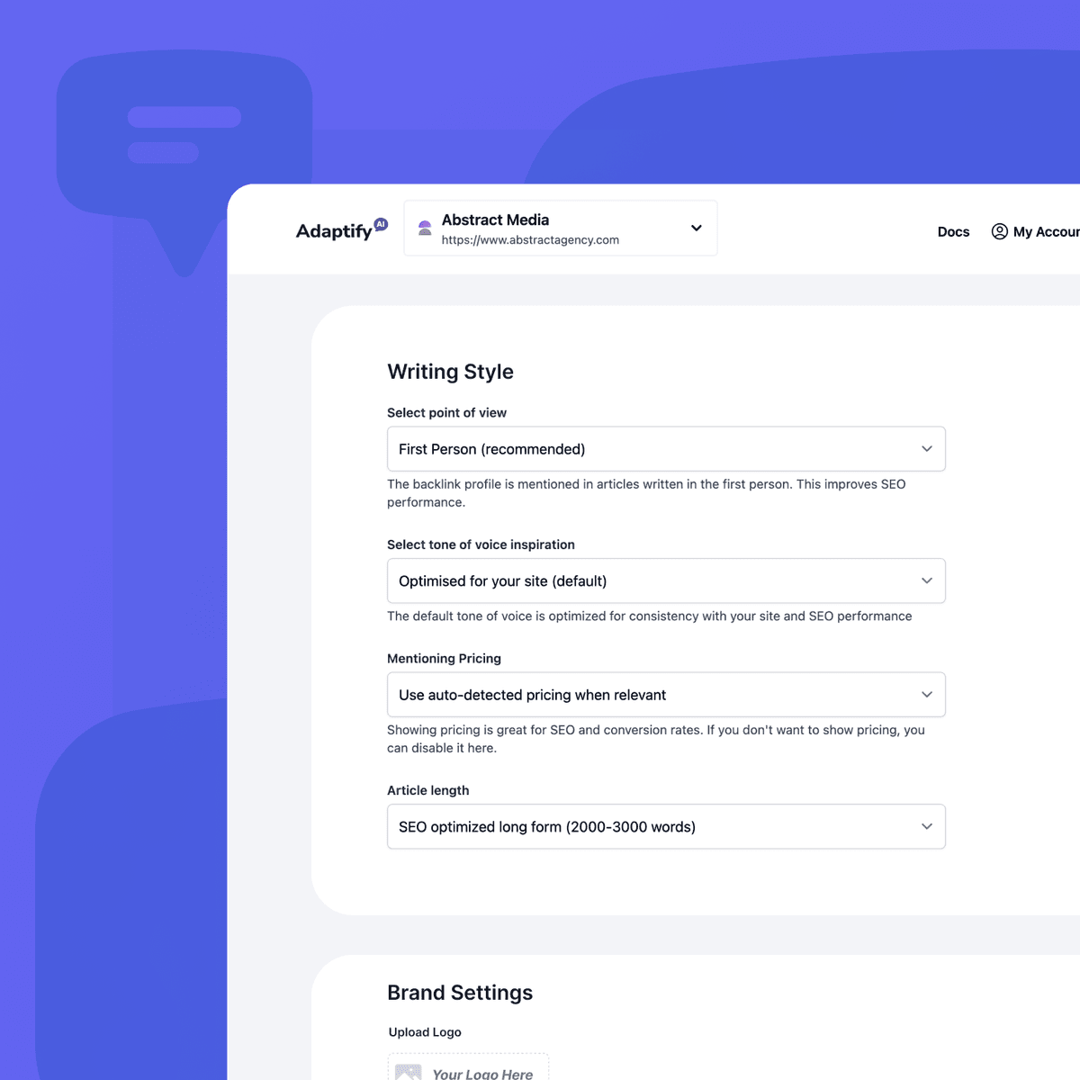 Adaptify's article writer fully automates blog content creation. Keyword research, content writing and publishing. It even customizes the tone to match your brand and applies best practices for SEO.