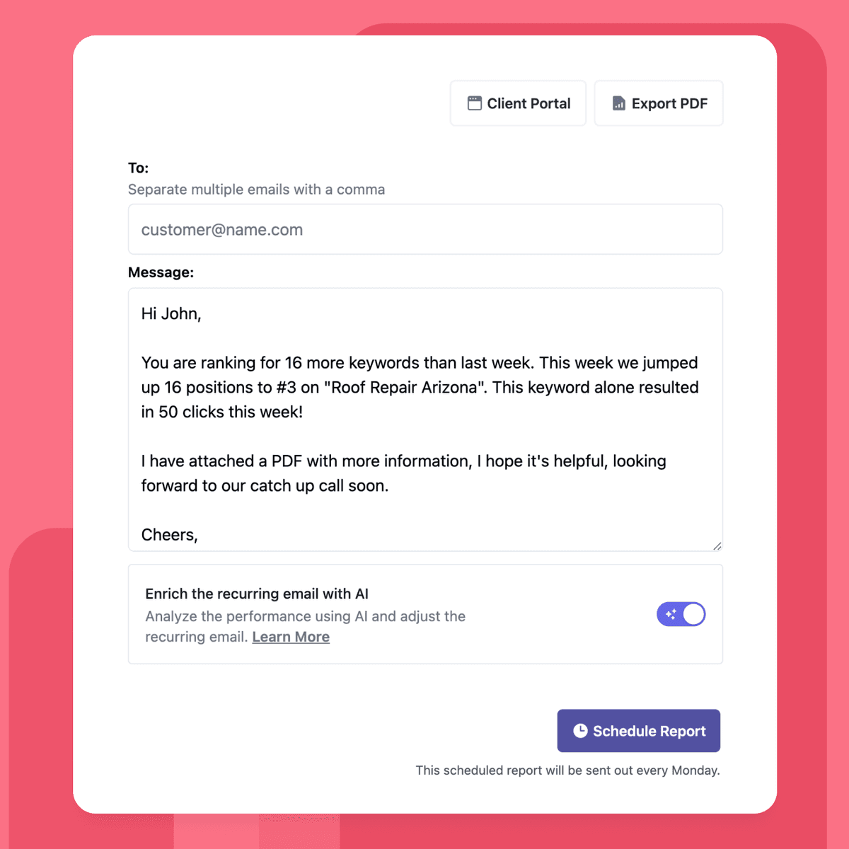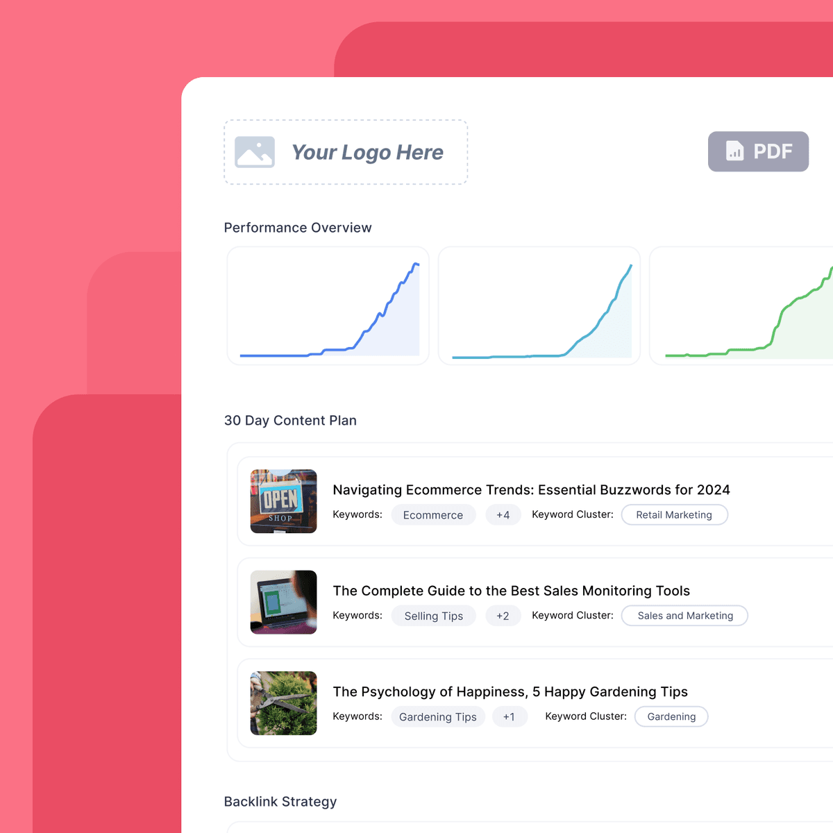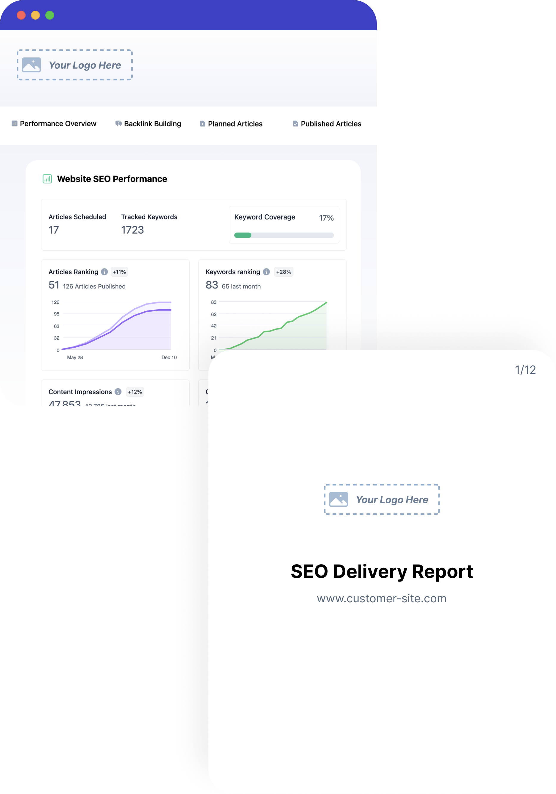 Showcase your agency's impact with beautiful, branded SEO reports generated and delivered to your customers automatically.