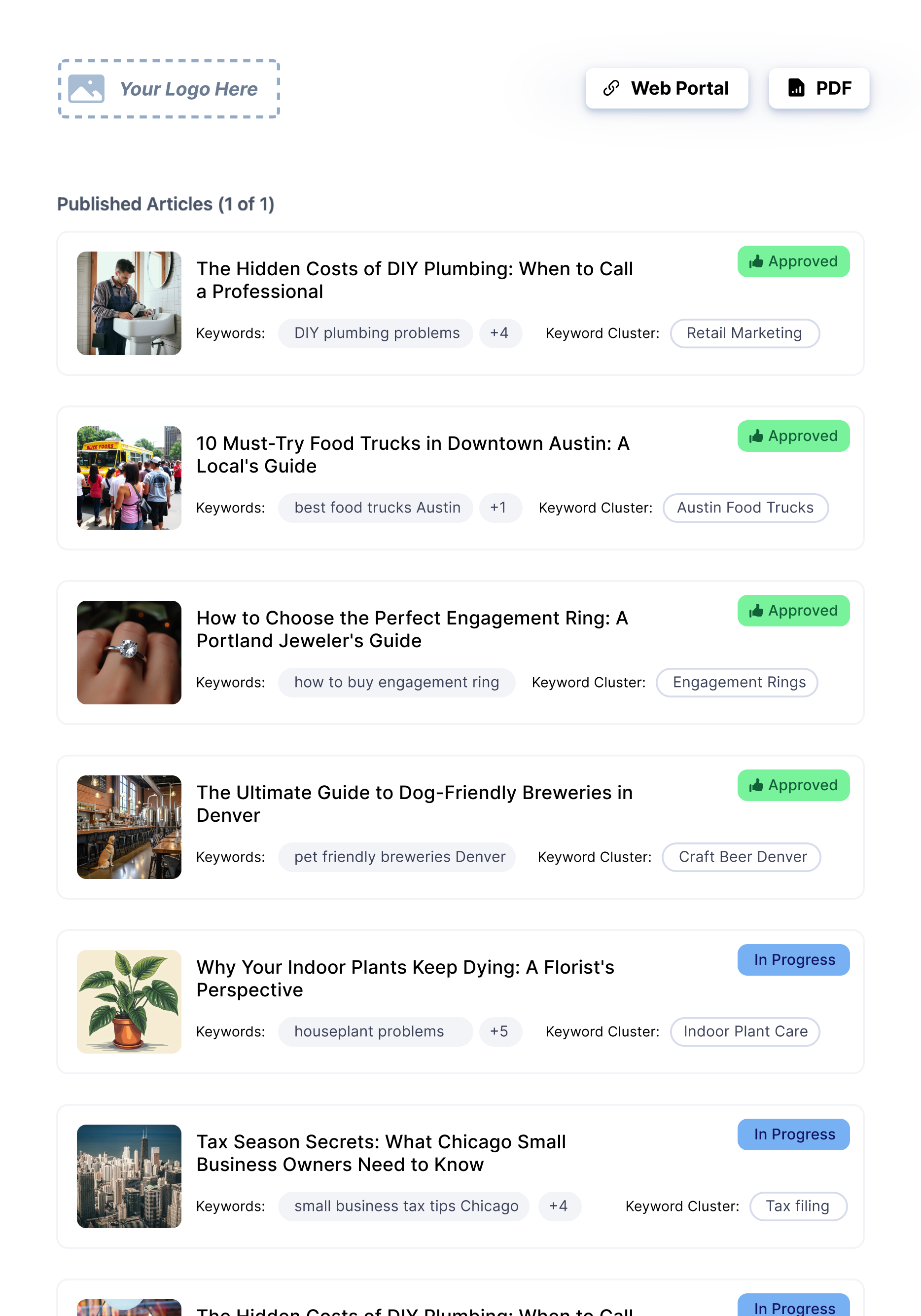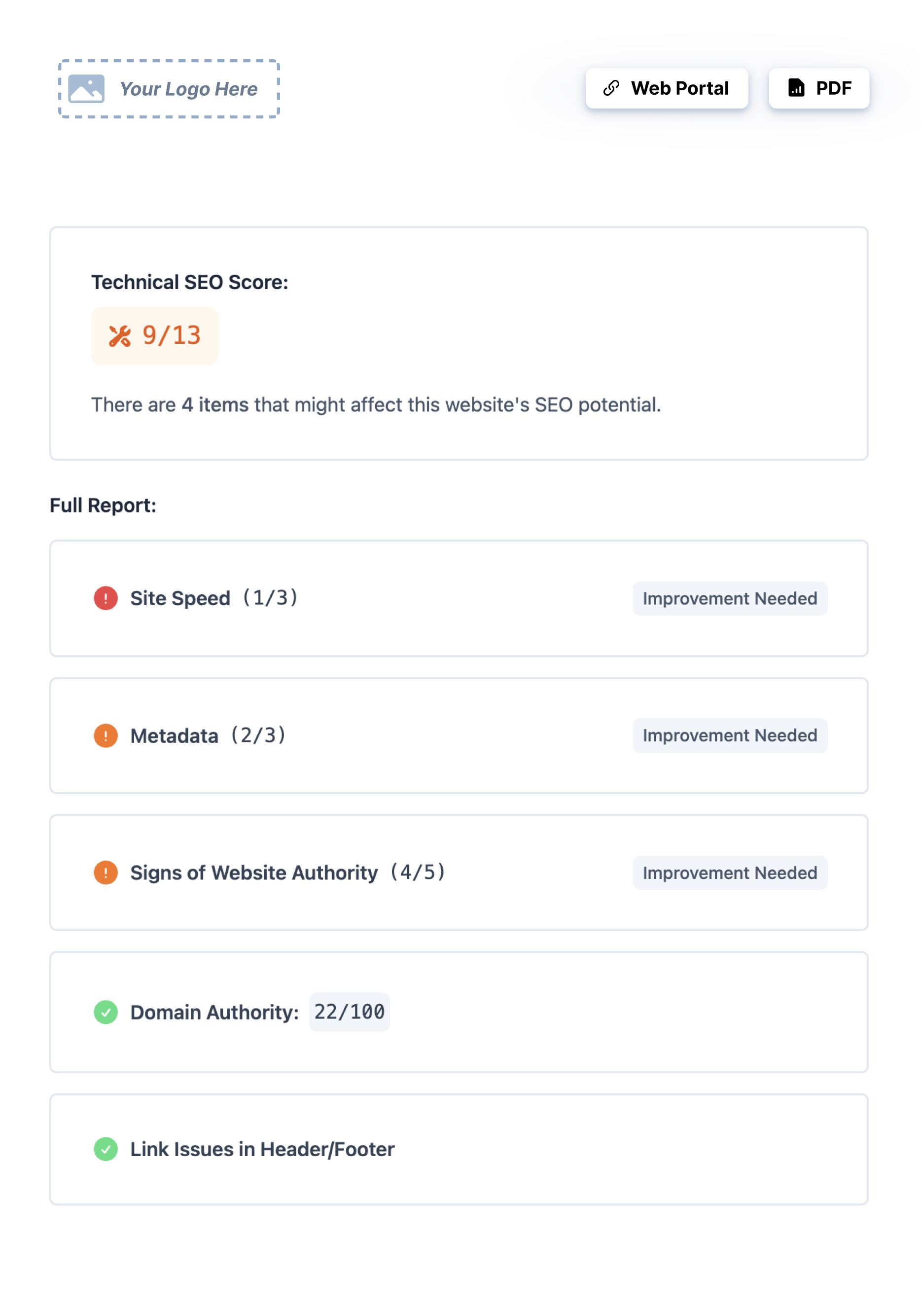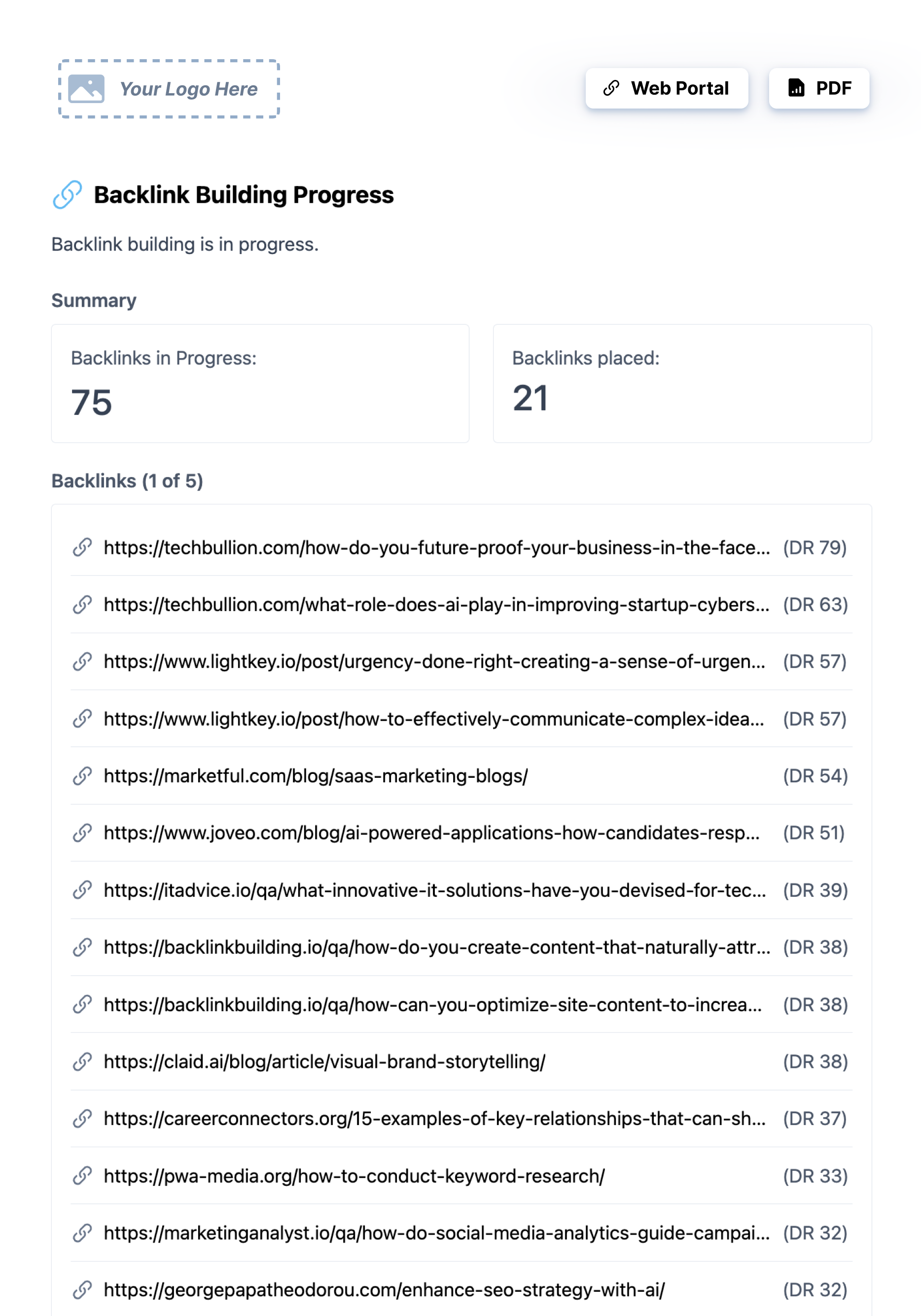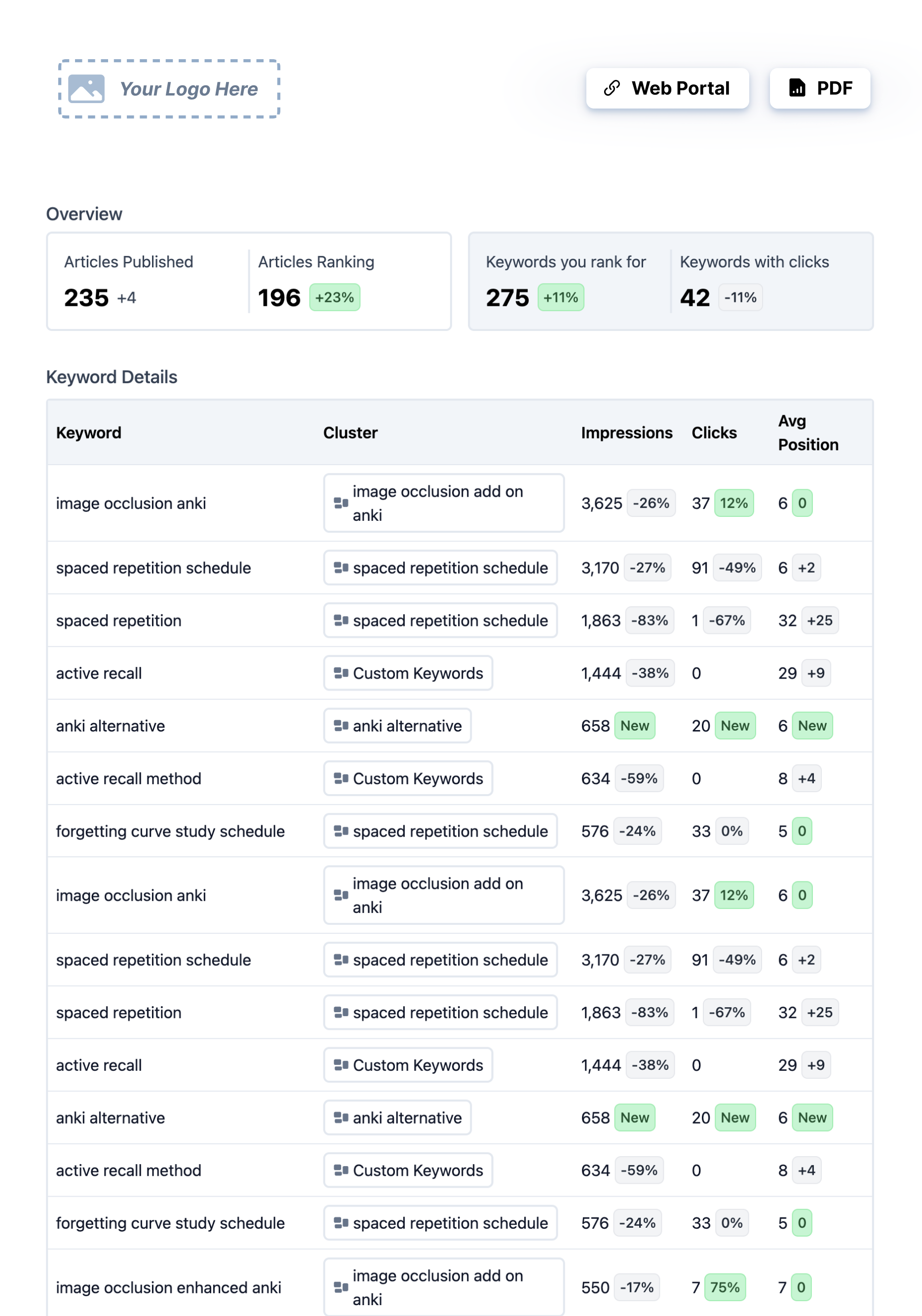 Showcase your agency's impact with beautiful, branded SEO reports generated and delivered to your customers automatically.